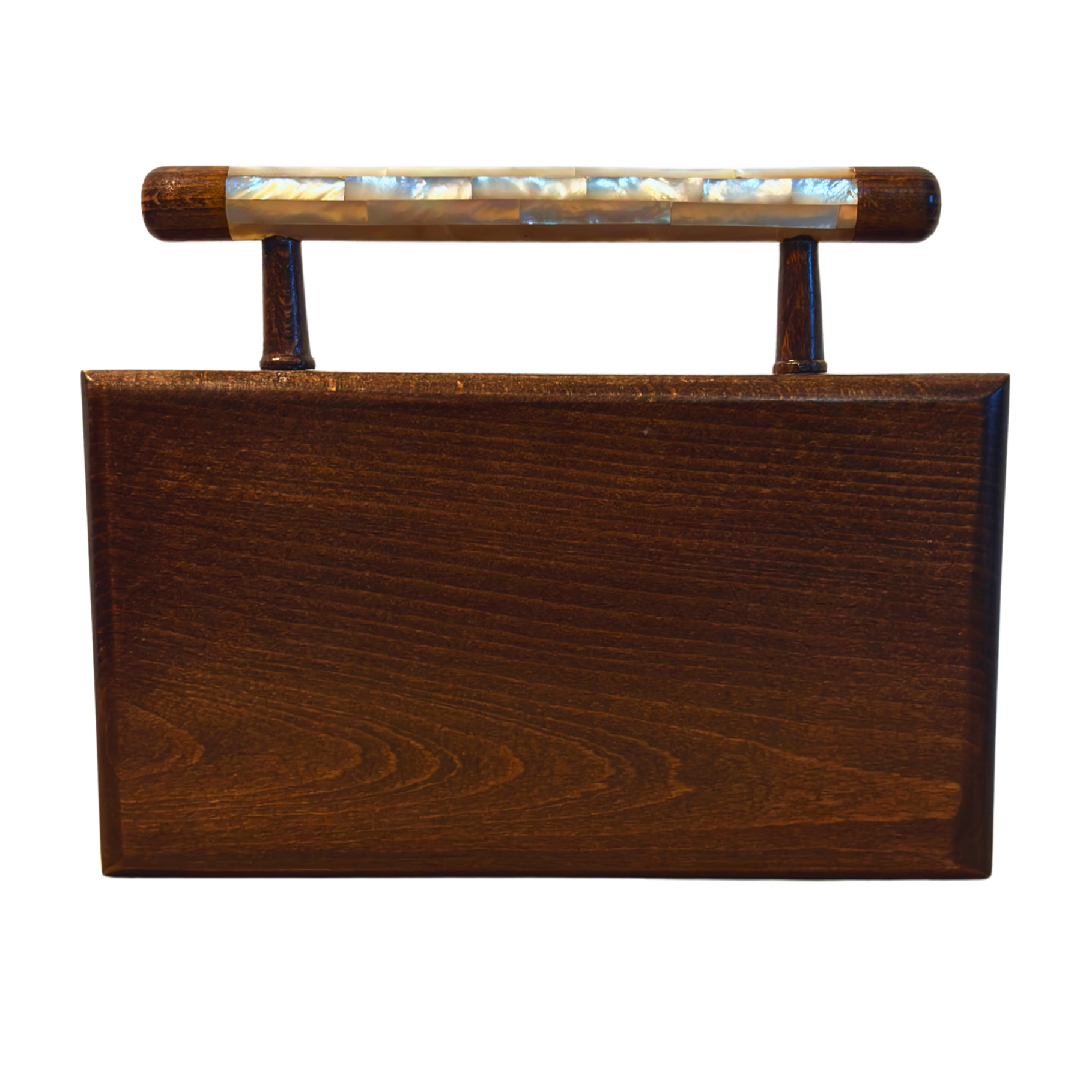 Yasmin clutch, Damascene clutch, jasmine inspiration, mother of pearl, oriental elegance, walnut wood, brocade interior, Damascus craftsmanship