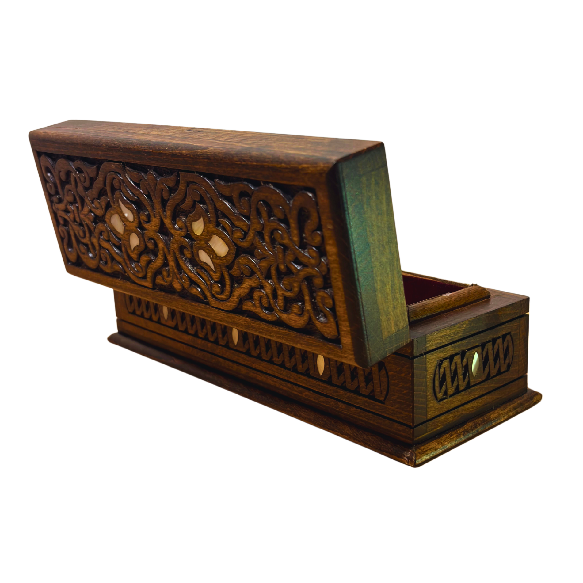 Finished in a dark walnut tone, the surface enhances the richness of the carving while highlighting the natural warmth of the wood. The interior is lined with luxurious wine-red velvet, offering refined protection for jewelry, pens, rosaries, and other cherished personal items.