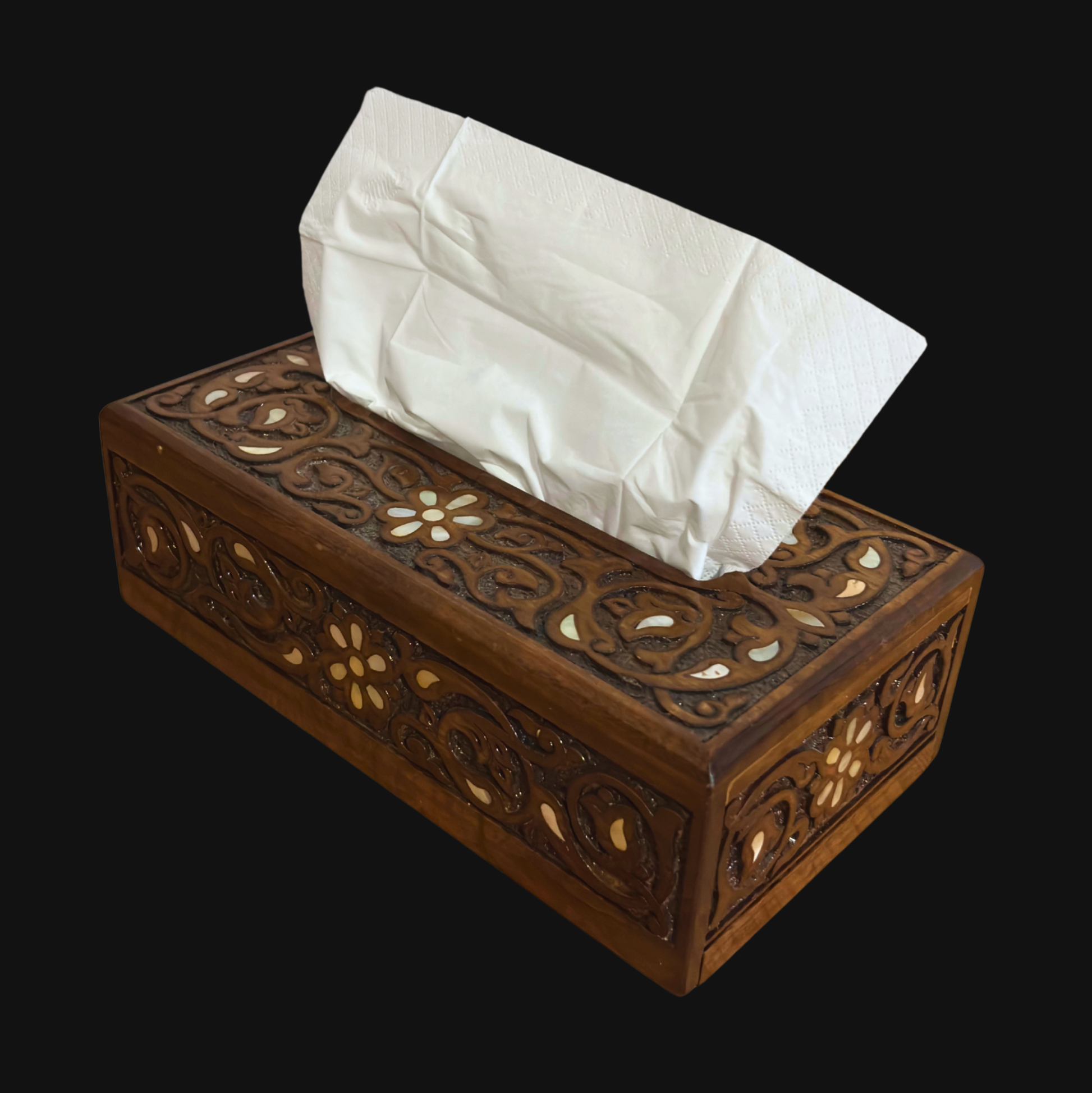 Caixa de Lenços em Faia Talhada à Mão – Acabamento em Nogal com Madrepérola
