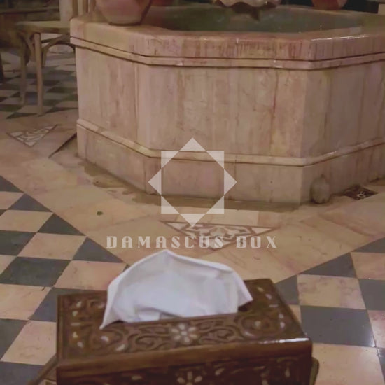 caixa de lenços artesanal, incrustações de madrepérola, arte damasquina, madeira oriental, acessório de luxo, arte em mosaico, Damascus Box